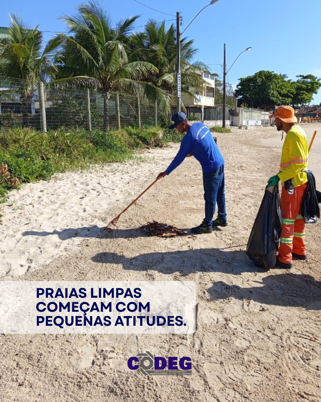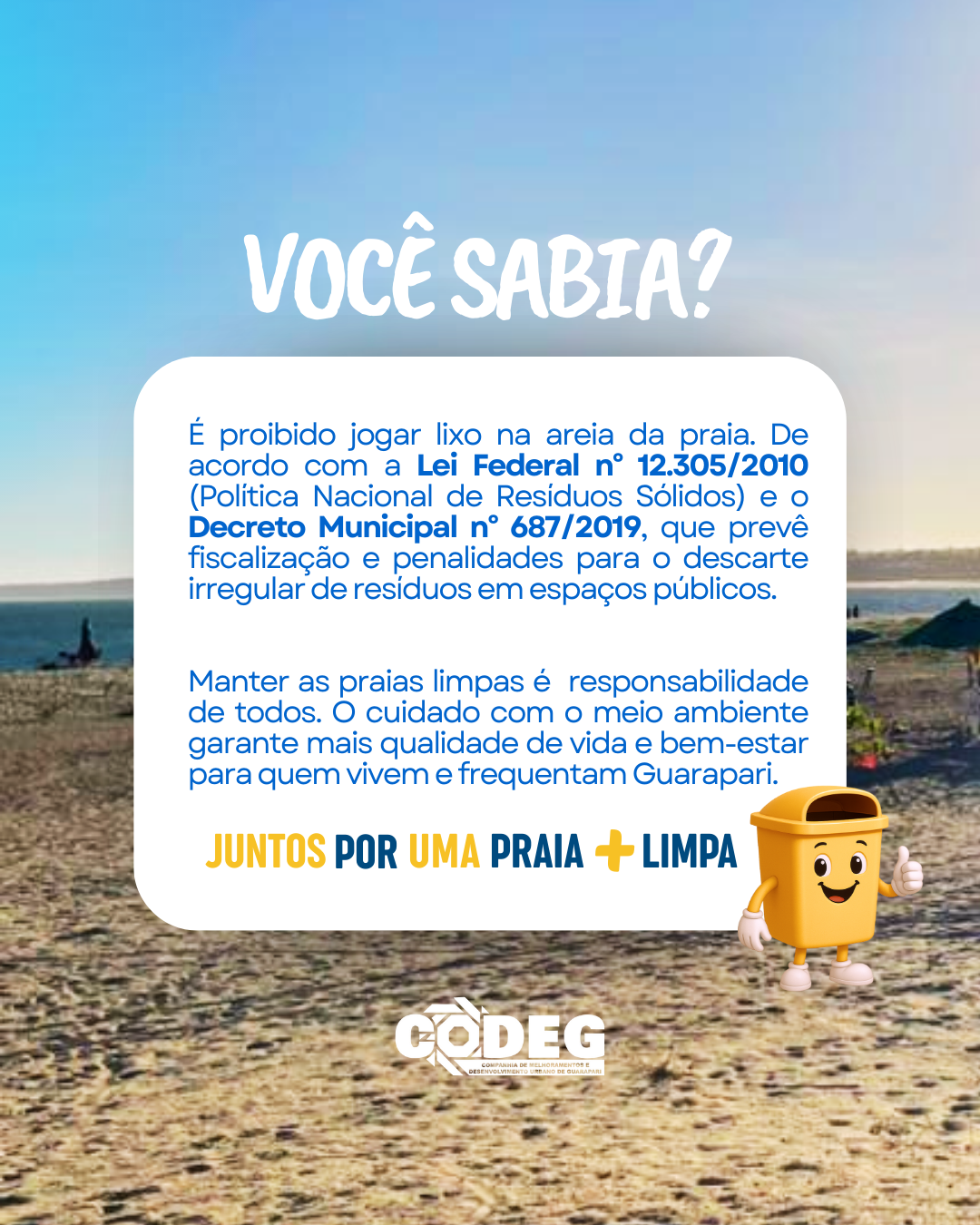 Para garantir a preservação das nossas praias, a CODEG reforça que é proibido o descarte irregular de lixo na faixa de areia, conforme a legislação vigente.