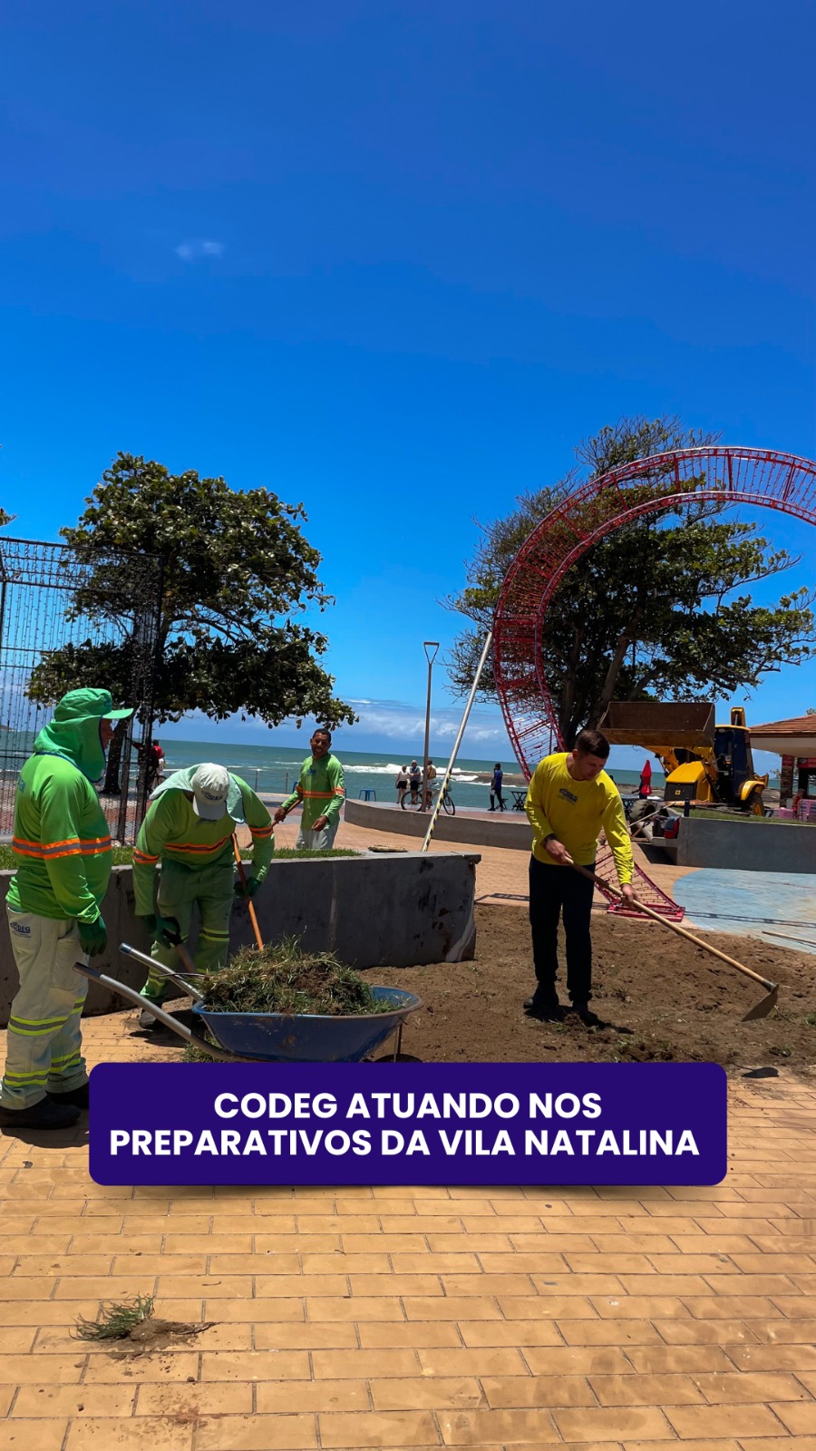 As equipes da CODEG, em parceria com a Prefeitura de Guarapari, estão trabalhando nos preparativos da Vila Natalina no Centro da cidade na pracinha próximo ao Hotel Coronado, com paisagismo, iluminação e limpeza pública.